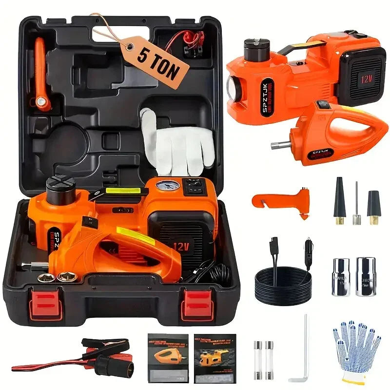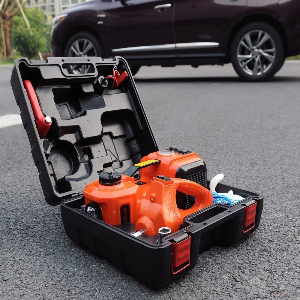 رافعة كهربائية هيدروليكية لرفع السيارات في حالات الطوارئ تأتي في صندوق قوي لسهولة النقل والتخزين ترفع الرافعة السيارات حتى 5 أطنان، أقصى ارتفاع 45 سم مثقاب قوي لفك وربط الإطارات بسهولة في حالة الطوارئ