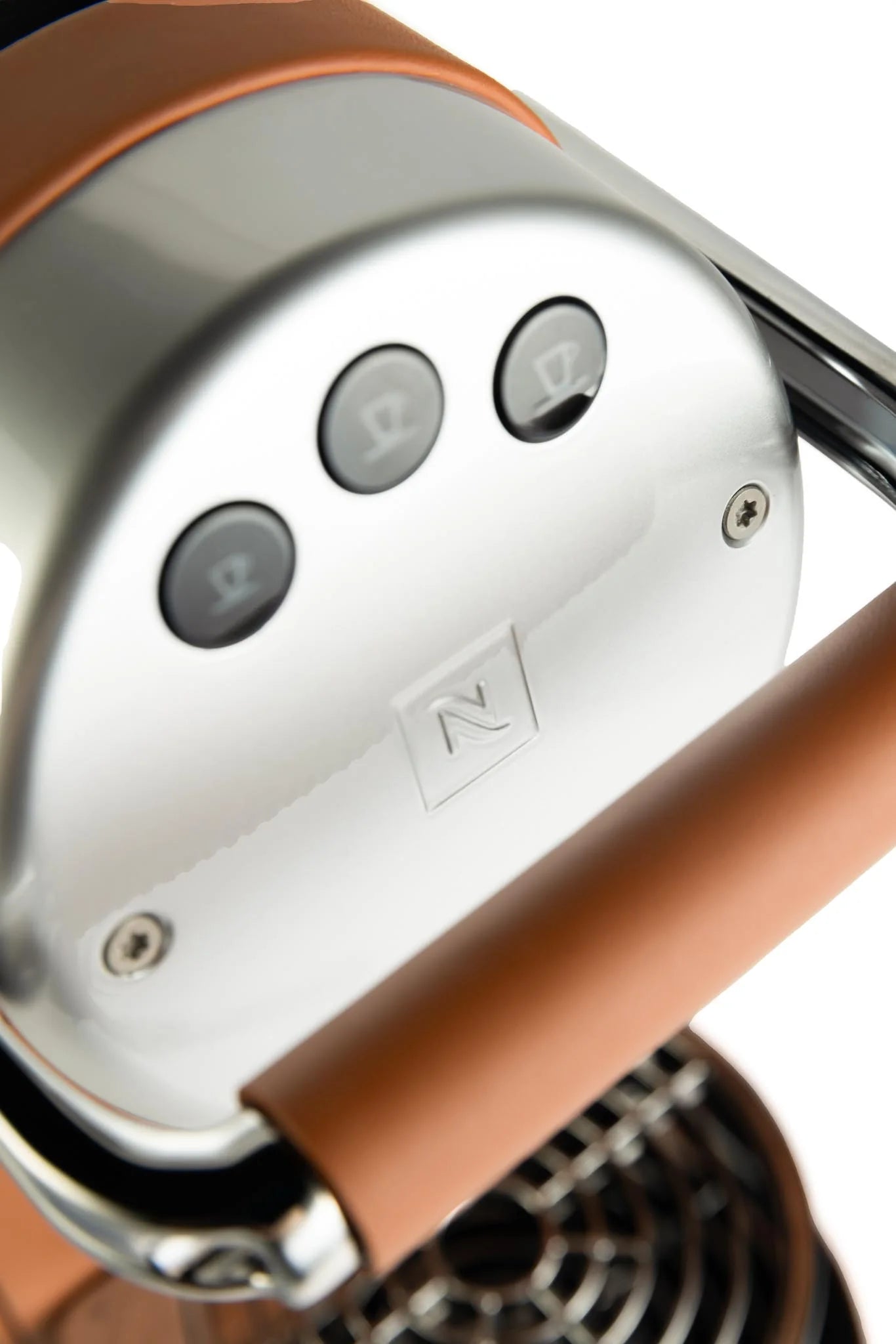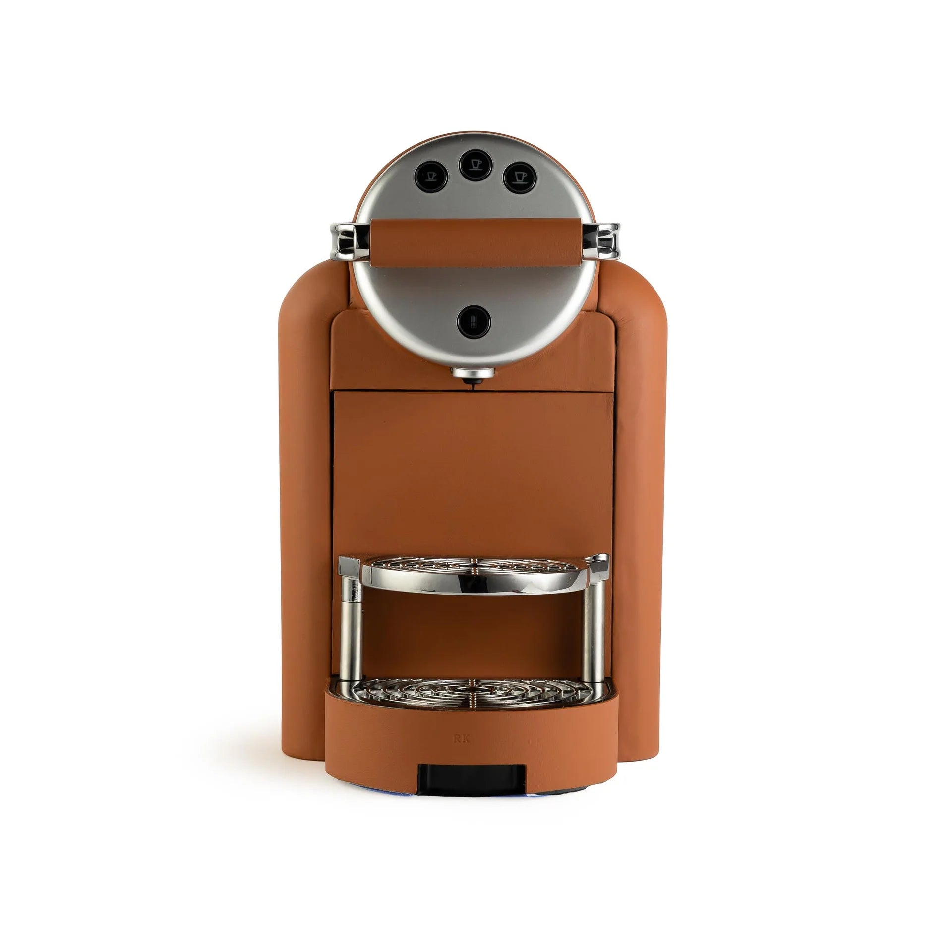 ماكينة احترافية لتحضير الإسبريسو، ملفوفة بجلد نابا الإيطالي الأصيل، تمنح مظهراً أنيقاً وجودة عالية. -