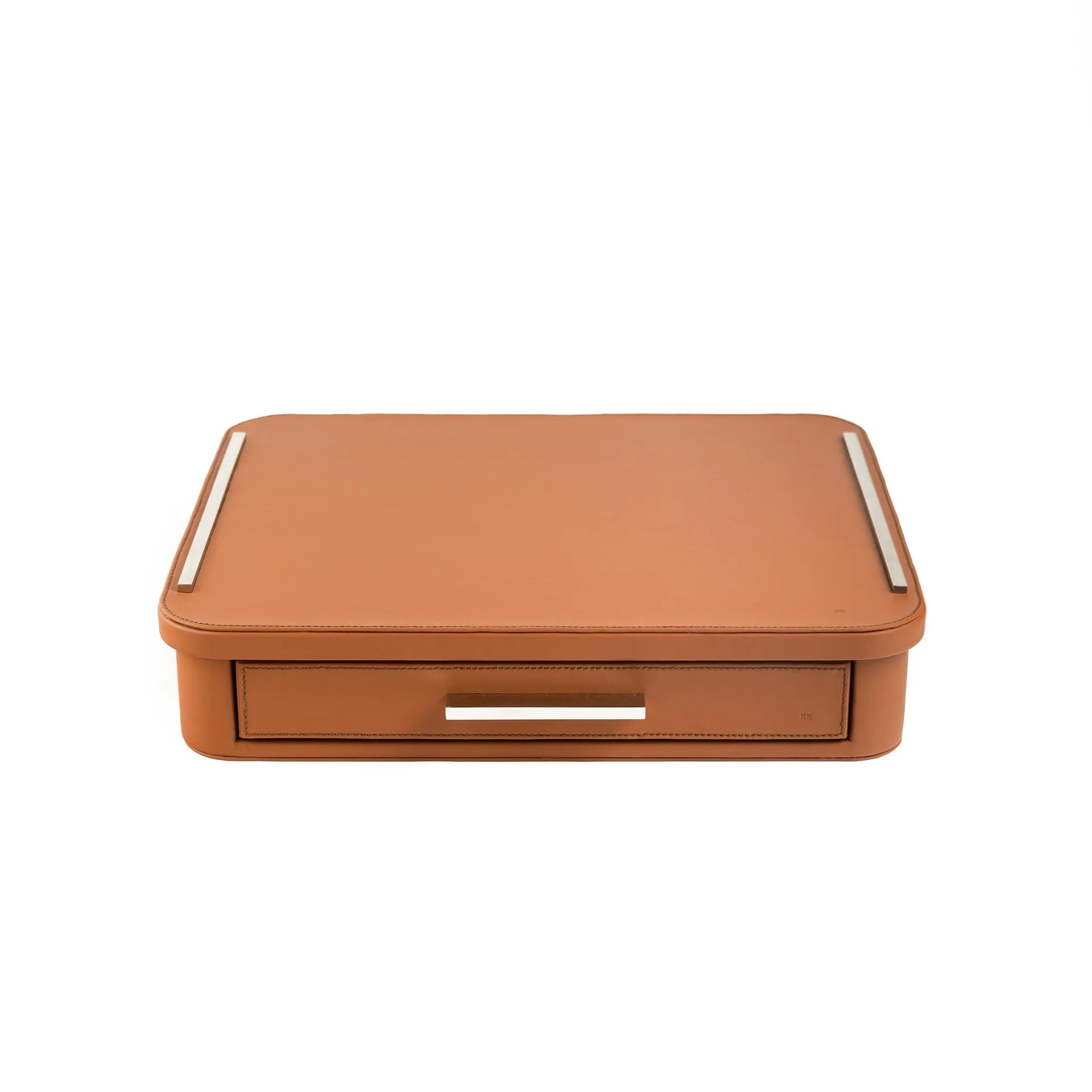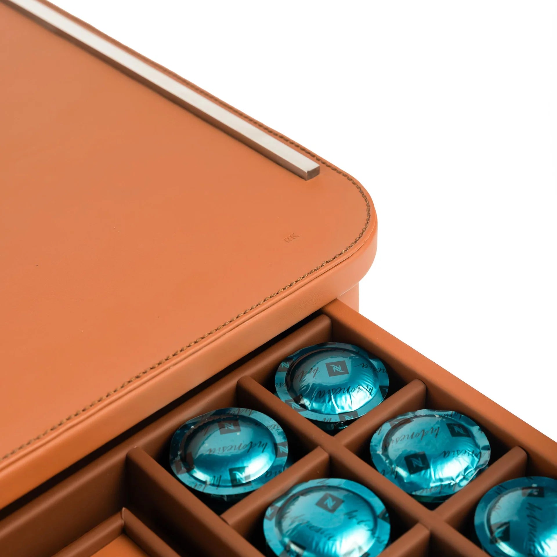 حافظة جلدية مخصصة لتنظيم الكبسولات والأدوات بشكل أنيق داخل درج مغطى بالكامل بالجلد. -